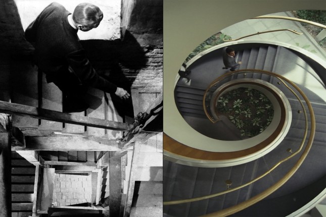 Стоит также отметить использование Сэмом Эсмейлом лестниц, особенно винтовых — это тоже своеобразный кивок в сторону классики, намек на подобные композиции у Хичкока, у которого очень часто лестницы являются местами опасности и интриг. В «Возвращении» они используются в качестве напоминания о, по сути, иерархической структуре повествования, где персонажи поднимаются и опускаются до разных уровней понимания общей картины, иногда меняя свое положение в пространстве. Есть кадр, где Колин поднимается вверх по золотой лестнице, что символизирует его неуемные амбиции.