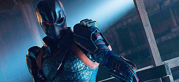 Экшн в конце действительно на хорошем уровне. Первое экранное воплощение Дефстроука которое действительно внушает. Технику стрельбы позаимствовали из Джона Уика, однозначно хороший пример) И что радует, даже при численном перевесе не смогли его одолеть и это было показано действительно качественно. Костюм у него опять же выполнен на хорошем уровне, гораздо лучше чем это было в какой-нибудь Стреле(ох уж эта Стрела).